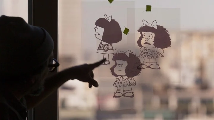 El archivo bien usado suele ser una maravilla, y vaya si Lorena Muñoz supo sacarle punta. La serie va y viene en el tiempo, de los bocetos de la primera Mafalda a las modernas pizarras en las que ahora los colegas del humorista gráfico mendocino -miembros de un posible club de fans, si quisieran- buscan replicar sus trazos.