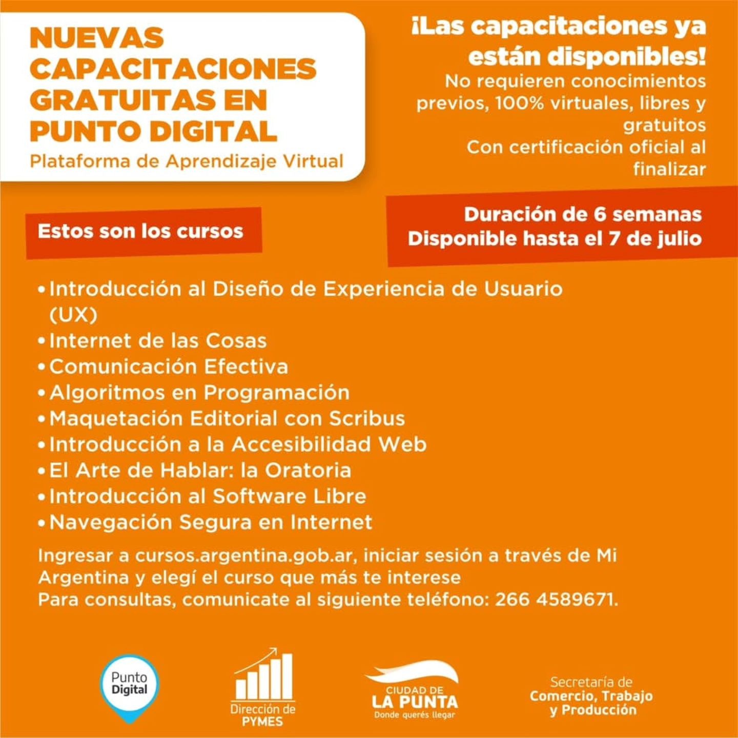 El Punto Digital de La Punta, en articulación con la Dirección de Pymes del municipio y el programa nacional Punto Digital, ofrece a los vecinos la posibilidad de acceder a una amplia variedad de capacitaciones gratuitas a través de la Plataforma de Aprendizaje Virtual.