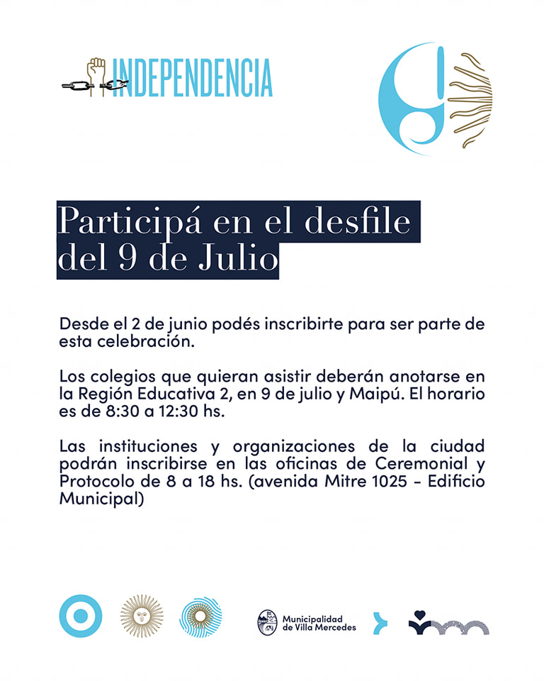 Desde el 2 de junio se encuentra abierta la inscripción para participar del tradicional desfile del 9 de Julio. La convocatoria está dirigida a escuelas, instituciones, clubes y organizaciones que deseen formar parte del evento patrio.