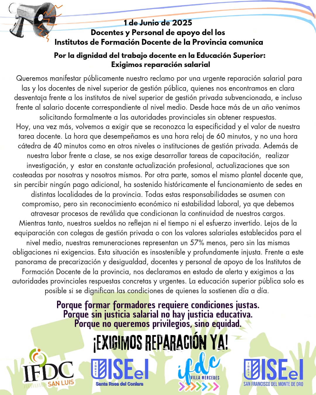 Los institutos de formación docente de San Luis, Villa Mercedes, Santa Rosa del Conlara y San Francisco del Monte de Oro unificaron su reclamo por una urgente reparación salarial que reconozca el valor de la educación superior pública.