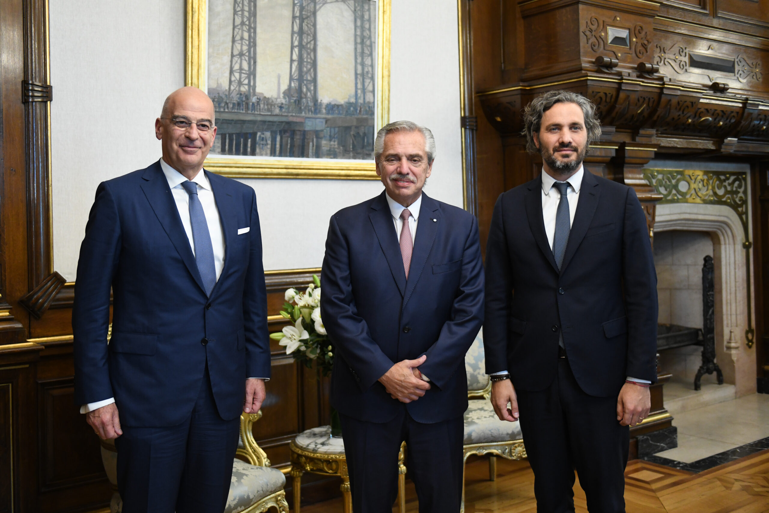 El presidente Alberto Fernández recibió en Casa Rosada al ministro de Asuntos Exteriores de Grecia, Nikos Dendias, quien realiza una visita oficial a nuestro país, con quien abordó diversos temas de la agenda bilateral y multilateral referidos a áreas claves como comercio, inversiones y cooperación en educación, deportes y tecnología espacial, entre otras.