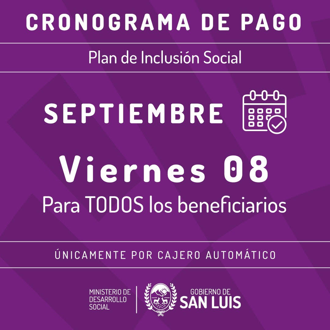 El viernes 8 de septiembre las beneficiarias y los beneficiarios de Inclusión Social cobrarán el pago correspondiente del mes de agosto. El beneficio se abonará el mismo día, es decir, terminaciones pares e impares de DNI lo harán la misma jornada.