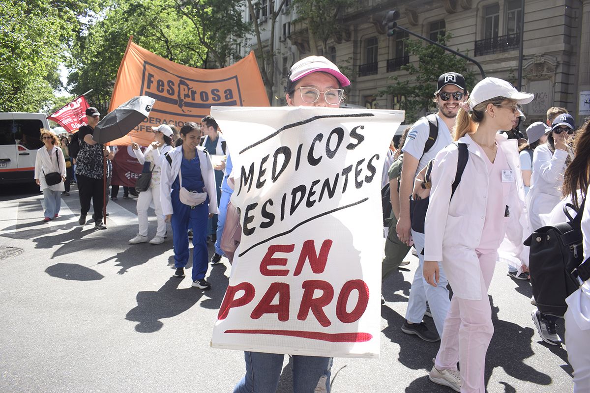 Residentes de hospitales como Garrahan, Bonaparte y Posadas marcharon de Congreso a Plaza de Mayo, junto a otros profesionales de la salud, estudiantes y docentes. Exigen mejoras salariales y un freno al embate contra la salud y la educación públicas.