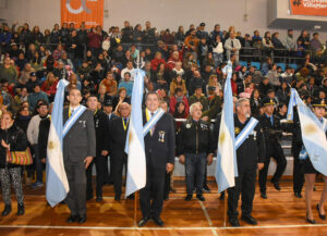 El Palacio Municipal de los Deportes recibió a cientos de familias que acompañaron a los 700 estudiantes y 56 soldados voluntarios de la V Brigada Aérea que realizaron su promesa y jura a la Bandera Argentina, respectivamente. La jornada estaba prevista en la avenida Mitre, pero debido a las bajas temperaturas, y para cuidar a los protagonistas, se trasladó al edificio de la calle Colombia, sin tener en cuenta la cantidad de personas que llegarían al lugar.