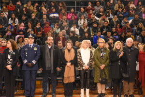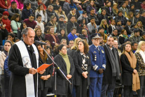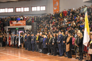 En un sector de las gradas, los chicos y chicas de 4to grado de 14 establecimientos educativos de la ciudad e invitados de localidades vecinas, lucieron sus impecables guardapolvos y uniformes en un día tan importante para nuestra comunidad. Maximiliano y Silvina entregaron los certificados a cada equipo directivo de las instituciones, y la jefa de Educación Superior del Ministerio de Educación de la Provincia, Margot Klug les tomó la promesa.