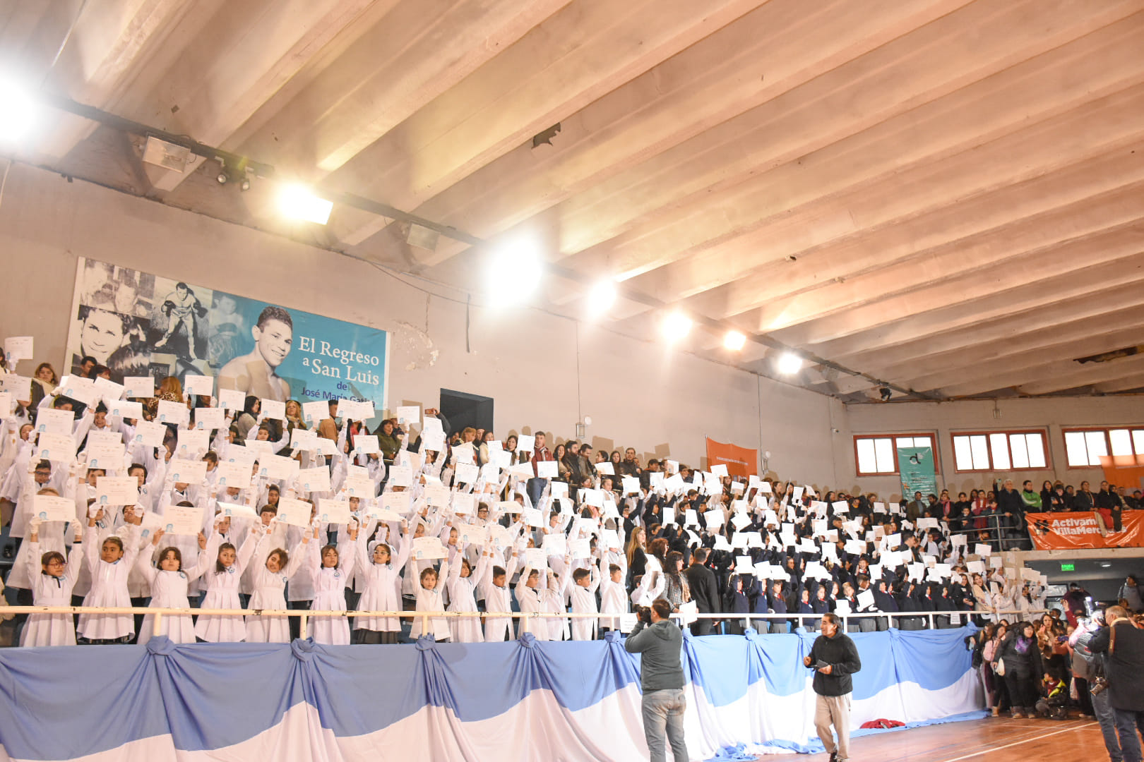 En un sector de las gradas, los chicos y chicas de 4to grado de 14 establecimientos educativos de la ciudad e invitados de localidades vecinas, lucieron sus impecables guardapolvos y uniformes en un día tan importante para nuestra comunidad. Maximiliano y Silvina entregaron los certificados a cada equipo directivo de las instituciones, y la jefa de Educación Superior del Ministerio de Educación de la Provincia, Margot Klug les tomó la promesa.