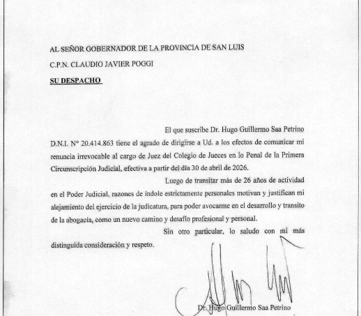 Hugo Guillermo Saá Petrino presentó su renuncia irrevocable al cargo de Juez del Colegio de Jueces en lo Penal de la Primera Circunscripción Judicial, que se hará efectiva a partir del 30 de abril de 2026.