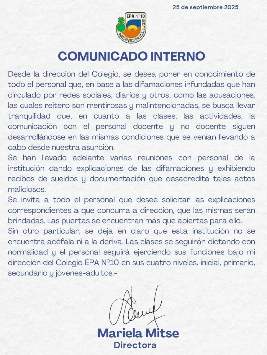 La dirección de la Escuela de Periodo Abierto (EPA) N°10 emitió un comunicado interno dirigido a su personal para aclarar la situación generada por una serie de acusaciones que circularon en los últimos días. En el escrito, la directora Mariela Mitse calificó de “mentirosas y malintencionadas” las difamaciones y sostuvo que tanto el nivel inicial, primario, secundario como el de jóvenes y adultos funcionan con total normalidad.