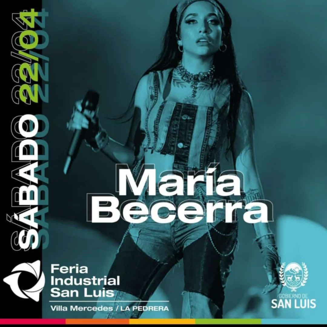 La “Nena de Argentina” llega a Villa Mercedes. María Becerra se presentará el sábado 22 de abril en la Feria Industrial, que será desde el jueves 20 hasta el domingo 23 en el Parque La Pedrera.