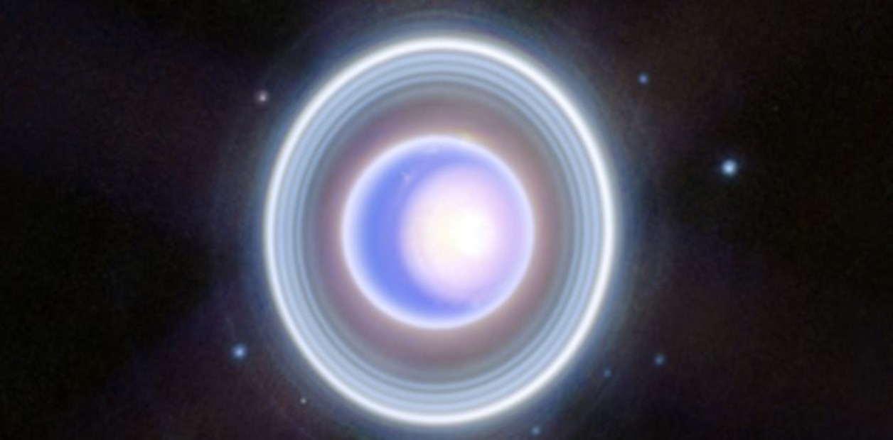 La imagen, tomada por la cámara NIRCam, también muestra 9 de las 27 lunas del planeta. Son los puntos azules que rodean sus anillos (en el sentido de las agujas del reloj, empezando por las dos: Rosalinda, Puck, Belinda, Desdémona, Crésida, Bianca, Porcia, Julieta y Perdita).