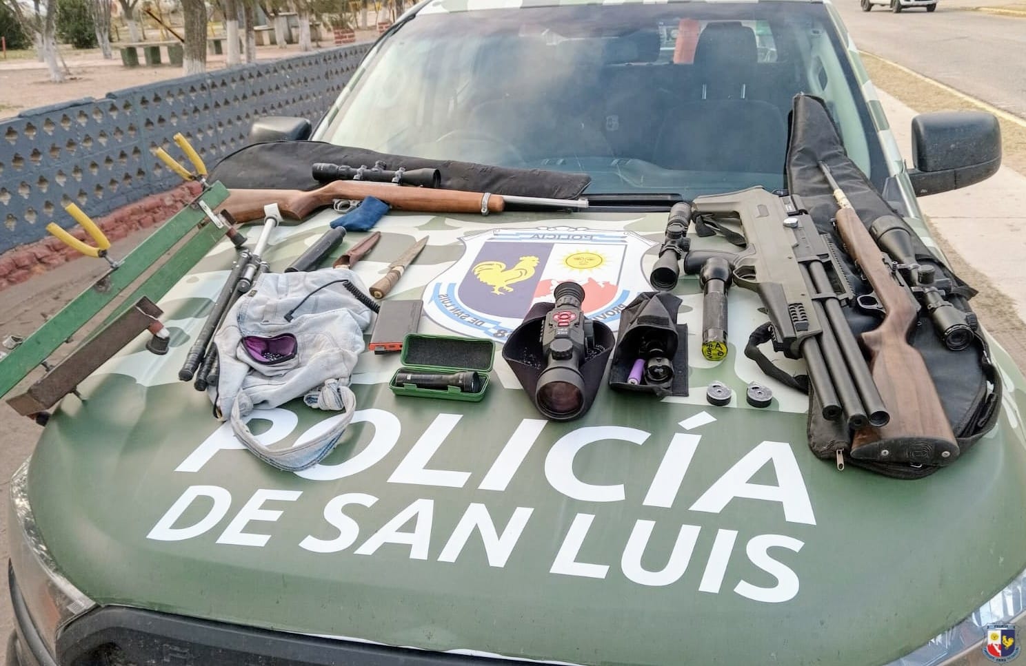 Asimismo, se les encontró dos cuchillos, miras telescópicas, linternas, y distintos elementos para la caza.