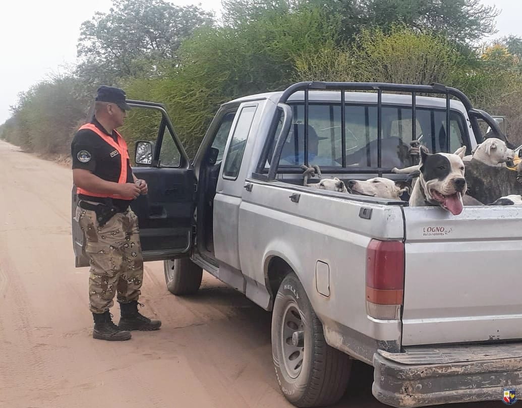 Mientras realizaban recorridos de prevención por un camino rural, los policías interceptaron una camioneta Ford F-100 en la que circulaban dos hombres de 25 y 31 años de edad transportando varios perros dogos y galgos aptos para la caza.