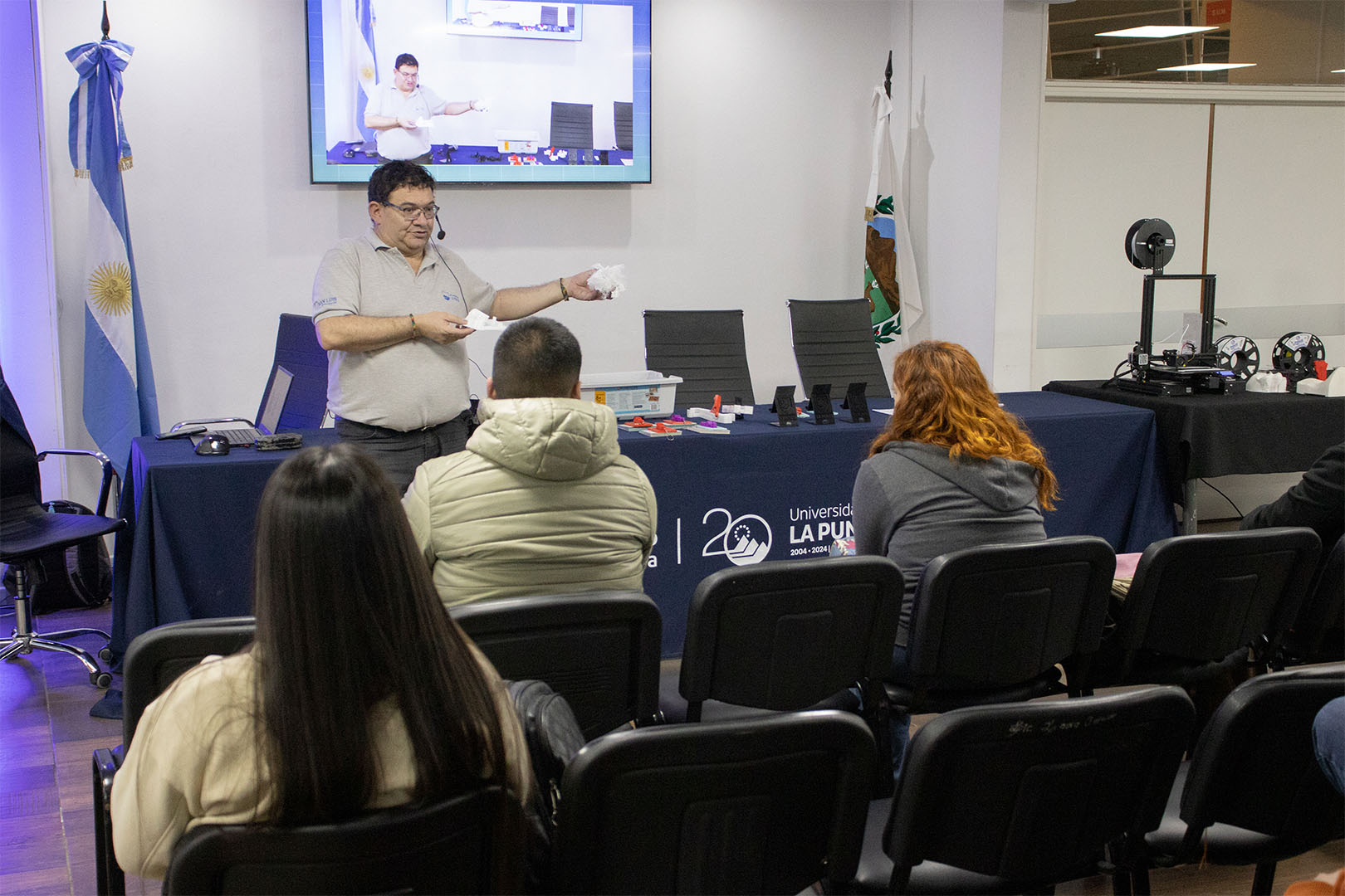 La actividad estuvo a cargo de Javier Esseff, docente e integrante del laboratorio de impresión 3D de la Universidad de La Punta (ULP). Durante la jornada, el instructor repasó conceptos del primer encuentro y explicó los tres pasos fundamentales para trabajar con esta tecnología: diseño, laminado e impresión. “En esta clase nos concentramos en el diseño, probablemente la etapa más desafiante. Es un proceso práctico para encontrar y modelar la pieza que cada participante busca crear”, señaló Esseff.