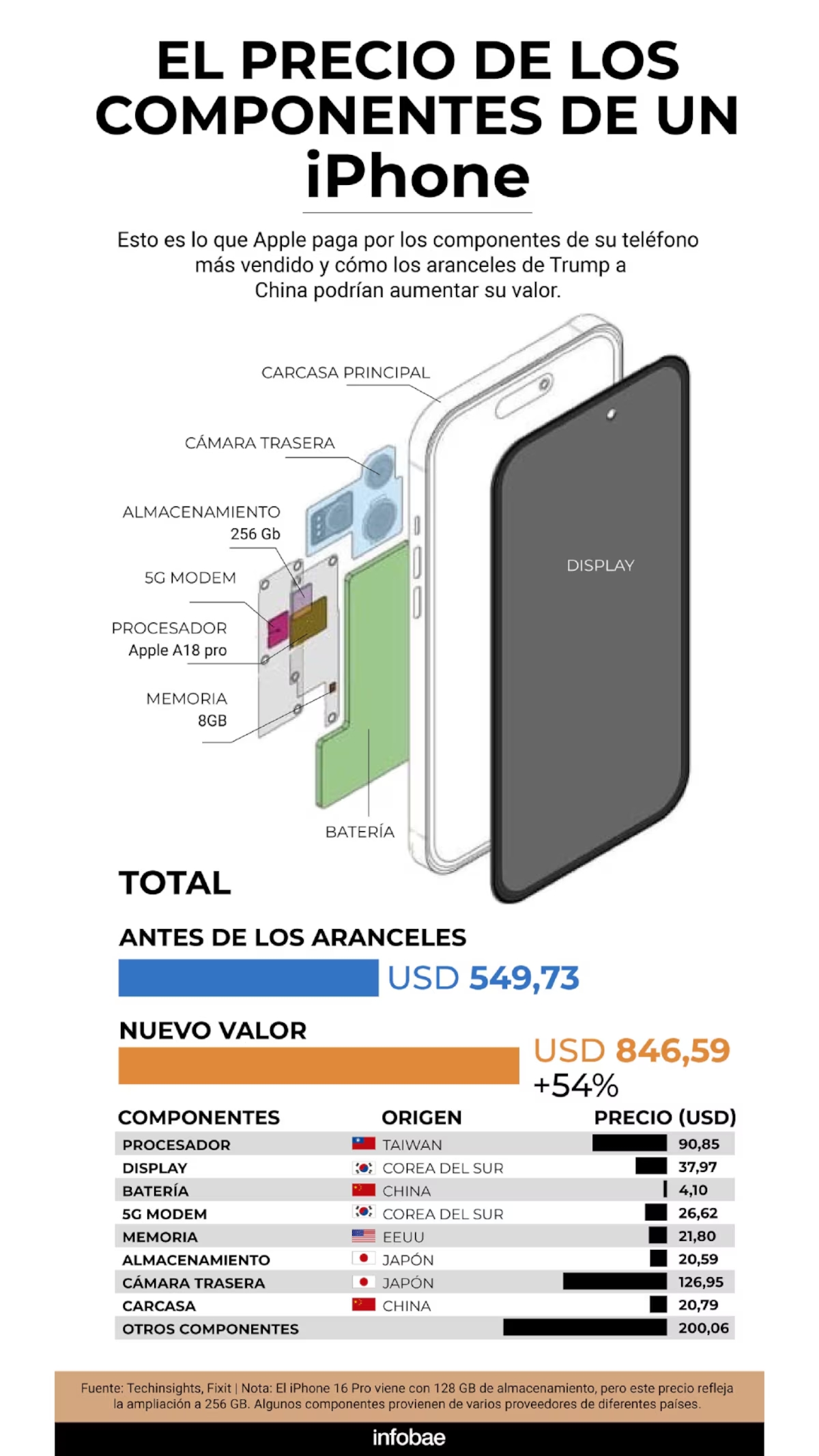 Incluso si Apple decidiera fabricar el iPhone en Estados Unidos, seguiría enfrentando impuestos sobre las numerosas piezas importadas. La fabricación local de cada componente, desde la pantalla táctil hasta el almacenamiento interno, podría elevar el costo del dispositivo a cifras exorbitantes, según publicó TechInsights. Por lo tanto, este complejo panorama sugiere que la producción de un smartphone a un precio competitivo en Estados Unidos es incierta.