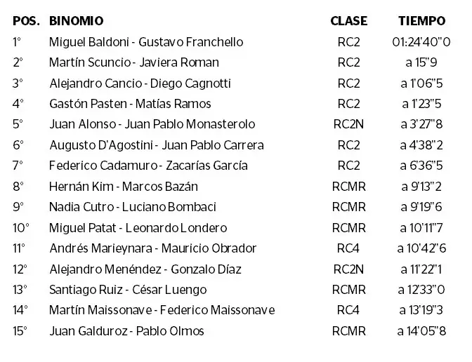 El sexto lugar quedó en poder de Augusto D’Agostini (Skoda) y Juan Pablo Carrera, quienes al mismo tiempo aseguraron su segundo triunfo consecutivo en la RC2 Copa “Héctor Letín Cancio”, certamen que los tendrá en la cima de los puntajes.