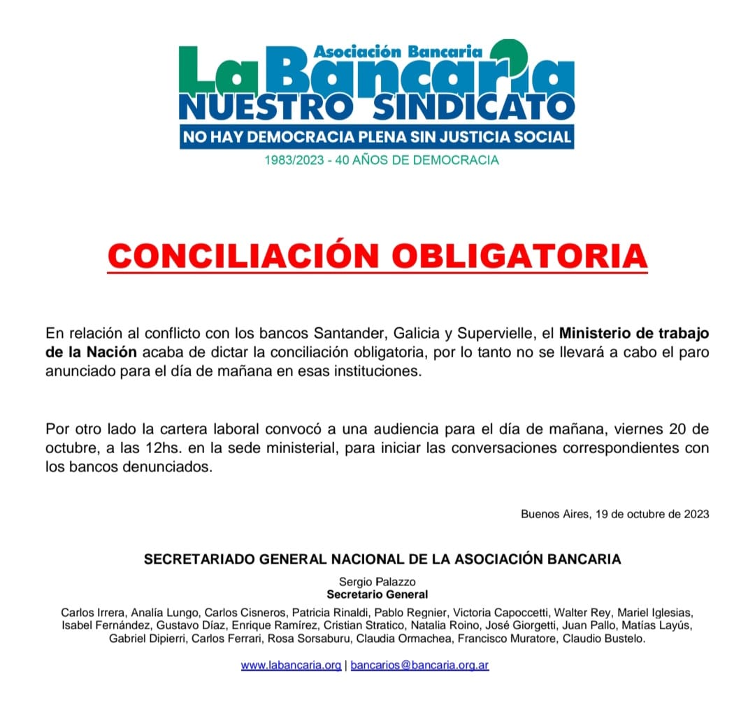 El Ministerio de Trabajo dicto este jueves la conciliación obligatoria y quedó suspendido el cese de tareas por 24 horas dispuesto para este viernes en los bancos Santander, Galicia y Supervielle, por una serie de demandas laborales.