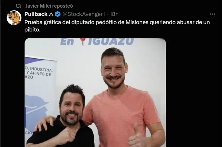 Prueba gráfica del diputado pedófilo de Misiones queriendo abusar de un pibito”, dice el texto que acompaña la foto del legislador Kiczka junto a Tetaz, publicada por un usuario, y reposteada por el Presidente, en un intento despegarse del acusado y asociarlo a sus aliados.