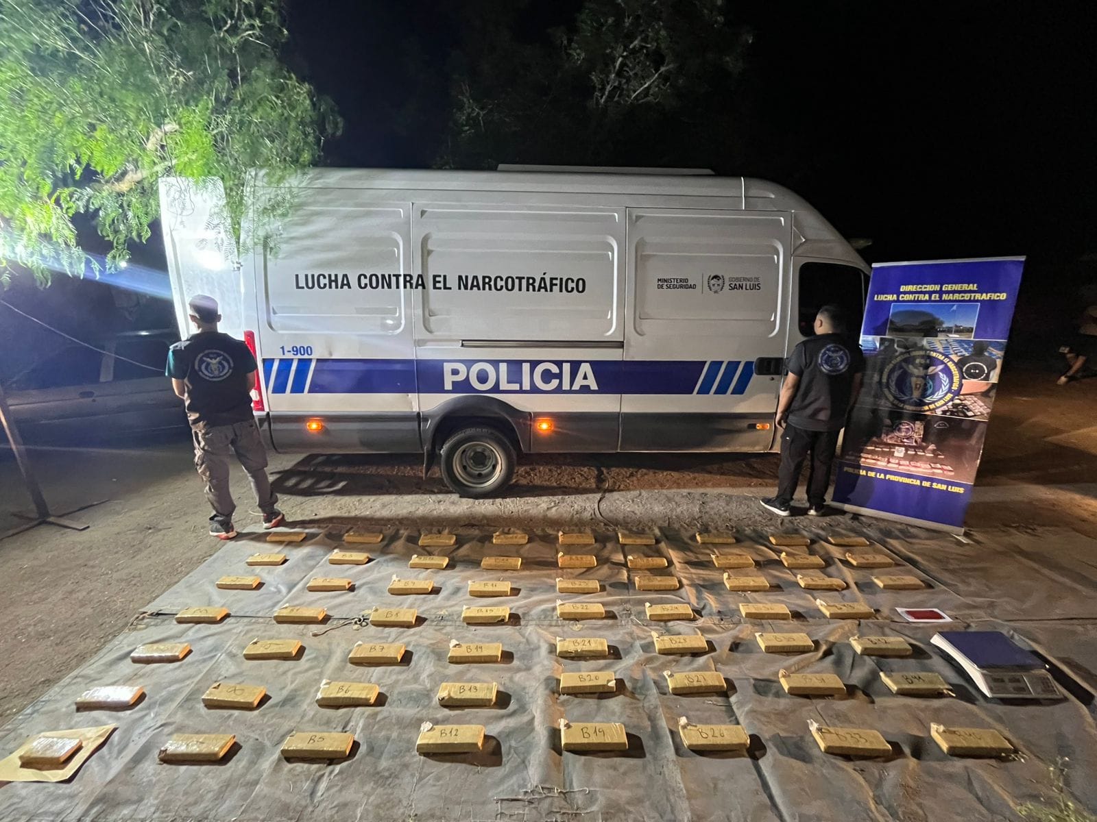 Posteriormente, se llevó a cabo un allanamiento ordenado por el Juzgado Federal de San Luis en un domicilio sobre la ruta nacional 146, al sur de la ciudad capital. En el lugar se desmanteló un centro de acopio de drogas, donde se secuestraron 59 paquetes prismáticos con marihuana compactada, una balanza de precisión y un teléfono celular.