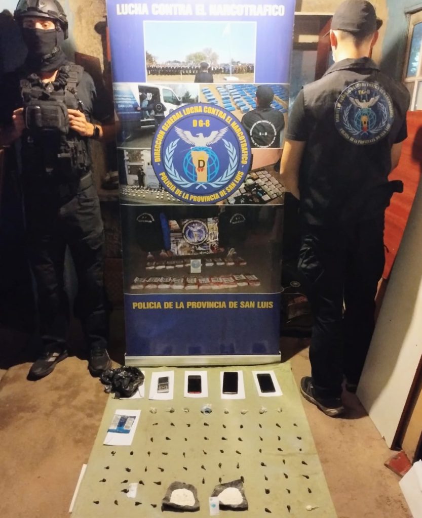 El allanamiento, ordenado por el Juzgado Federal de San Luis, se llevó a cabo en un domicilio ubicado en calle Juan de Garay. En el lugar, la Policía incautó envoltorios de nylon con marihuana, suficientes para la elaboración de 57 dosis valuadas en $171.000, y envoltorios de nylon con cocaína, equivalentes a 460 dosis valuadas en $2.300.000. También se secuestraron tres teléfonos celulares, una balanza de precisión, elementos utilizados para el estiramiento de sustancias y varios recortes de nylon.