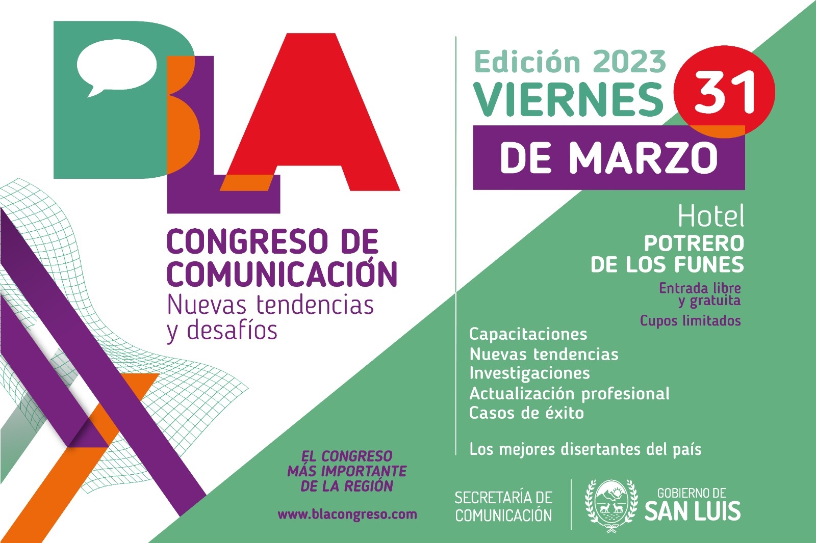 El encuentro, organizado por el Gobierno provincial, será el 31 de marzo en el Hotel Potrero de los Funes y estará destinado a profesionales, estudiantes y público en general. Con entrada libre y gratuita tratará temas relacionados a nuevas tecnologías, redes sociales, diseño e innovación. Con cupos limitados, pueden inscribirse en blacongreso.com.