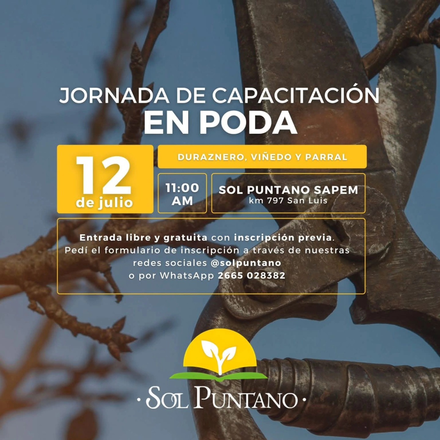 Este viernes 12 de julio, entre las 11:00 y las 16:00, se llevará a cabo una jornada gratuita de capacitación en poda en el predio de Sol Puntano, ubicado sobre la Ruta Nacional 7, kilómetro 797,3, camino a Mendoza.