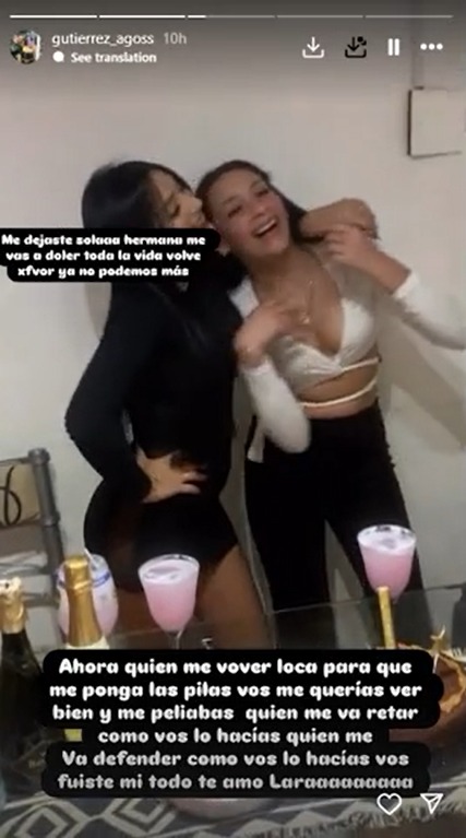 Horas después, y a modo de despedida, Agostina subió fotos y videos junto a Lara. “Me dejaste sola hermana, me vas a doler toda la vida. Volvé por favor ya no podemos más”, lamentó la joven en su mensaje, al cual acompañó con un video de ambas en lo que parecería haber sido un brindis. Y en esa línea, agregó: “Ahora quién me va a volver loca para que me ponga las pilas, vos me querías ver bien y me peleabas. Quién me va a retar como vos lo hacías, quién me va a defender como vos lo hacías. Vos fuiste mi todo, te amo Laraaaaaaaa”.