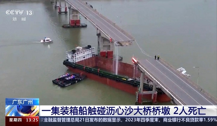 El parte oficial da cuenta que tres camiones de escaso tamaño, un minibús y una moto cayeron del puente Lixinsha alrededor de las 5:30 (hora local), tras la colisión del buque carguero que hizo que parte de la estructura cediera.