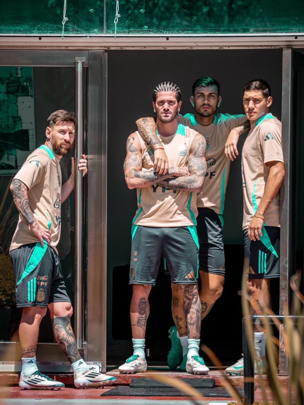 Otra muestra a dos sonrientes Messi y De Paul, quienes están sentados sobre una pelota cada uno. El capitán y el Motorcito tienen una gran relación dentro y fuera del campo de juego. Ambos son referentes del proceso a cargo de Lionel Scaloni como entrenador y que logró la Copa del Mundo en Qatar 2022, las Copas América en Brasil 2021 y Estados Unidos este año; y el título intercontinental llamado La Finalissima en 2022, ante el entonces campeón europeo, Italia.